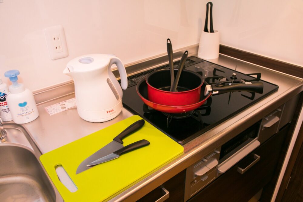 -Kitchen (refrigerator, microwave, toaster oven, rice cooker, electric kettle, Electric griddle with takoyaki plate)
