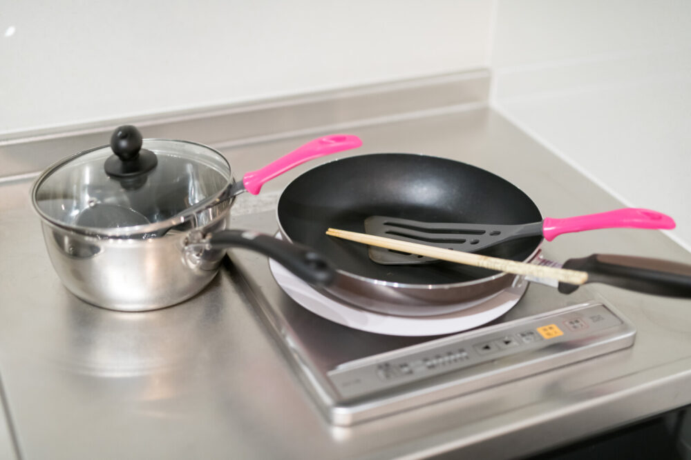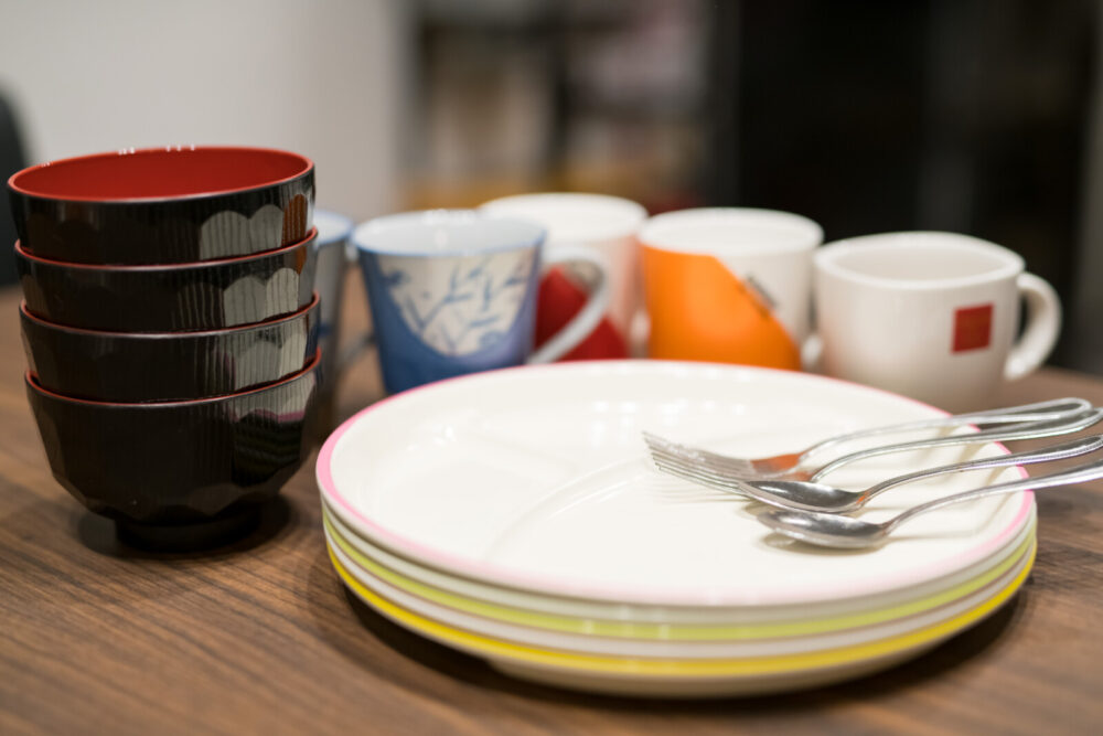 -Kitchen (cooking utensils, tableware, refrigerator, microwave, toaster, rice cooker, electric kettle, seasonings: oil, salt and pepper, tabletop grill)